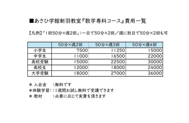 お知らせ 「数学専科コース」のお知らせ~新羽教室~ 数学を伸ばしたい小学生・中学生・高校生・社会人のための「数学専科コース」のお知らせです。 ●私立中学の体系数学に苦労している ●理系看護医療系受験で数学を伸ばしたい ●資格試験・SPIなど数学が必要な社会人 そんな数学を伸ばしたい人のためのコースです。